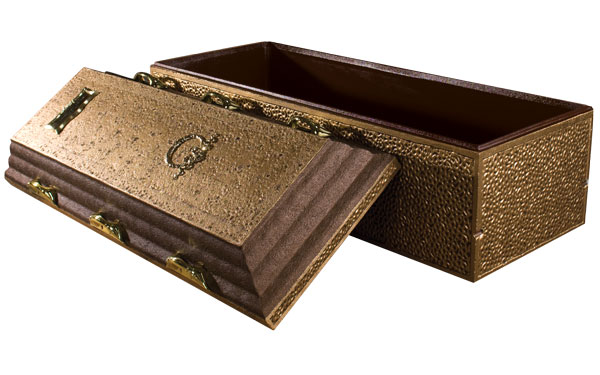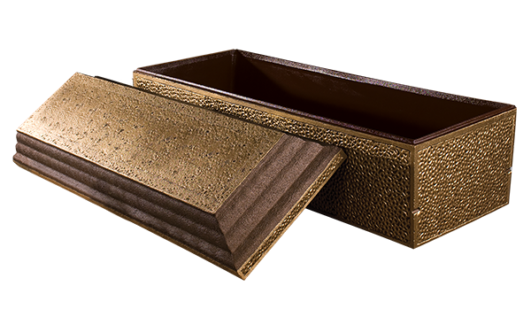 The interior liner may be customized. Choose the textured brown surface or the simulated wood grain. The Trilogy is a concrete reinforced vault with an arched cover, tongue and groove design, tape seal and thermoformed polymer liner.