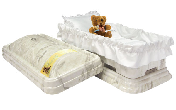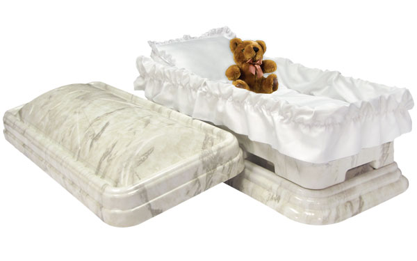 Our toddler casket vault has a sunburst cover design and matching base. It includes a full couch cover and is available in pure white, white marble, pink swirl or blue swirl.